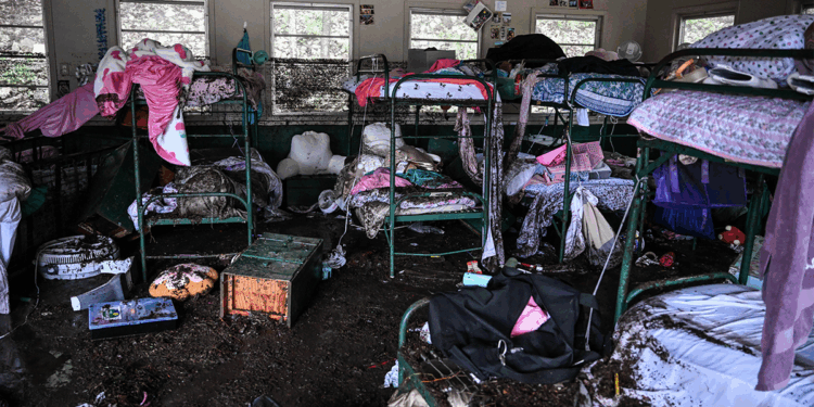 A view of a damaged building at Camp Mystic in Hunt, Texas. (RONALDO SCHEMIDT/AFP via Getty Images)