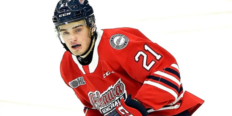 Jacob Winterton of the Oshawa Generals skates against the Mississauga Steelheads during a game at Paramount Fine Foods Centre in Mississauga, Ontario, Canada, Oct. 25, 2019. (Graig Abel/Getty Images)