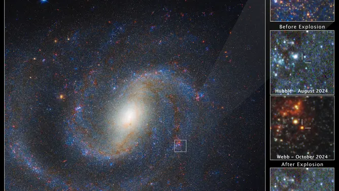 The main image at left shows a combined Webb and Hubble view of spiral galaxy NGC 1637. Panels at right show a detailed view of a red supergiant star before and after it exploded.
