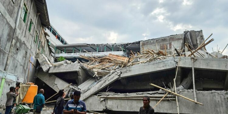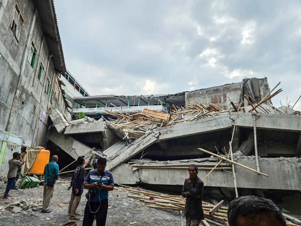 A SCHOOL packed with students crumbled without warning in Indonesia, leaving dozens trapped and sparking a frantic rescue operation.