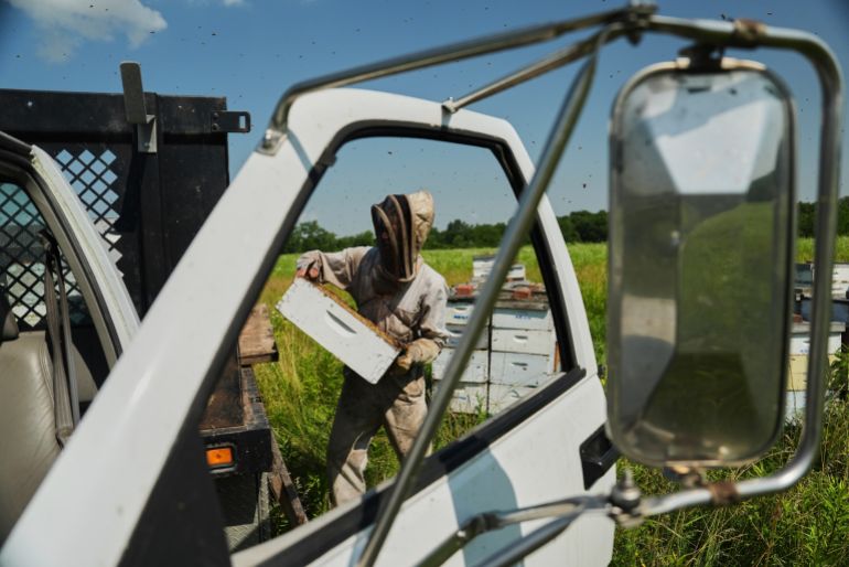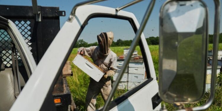 Sweat covers Isaac Barnes’s face under his beekeeper’s veil as he hauls boxes of honeycomb from his hives to his truck. It is a workout in what feels like a sauna as the late-morning temperatures rise.