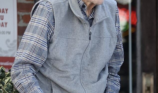 Hackman, who turned 94 in January, was dressed perfectly for a casual day out, sporting a gray fleece sweater over a casual plaid shirt, outdoor green pants, and black sneakers