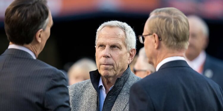 New York Giants executive vice president Steve Tisch, center, before a game against the Denver Broncos at Sports Authority Field at Mile High in Denver, Colo., Oct. 15, 2017. (Isaiah J. Downing/USA Today Sports)