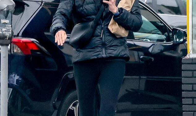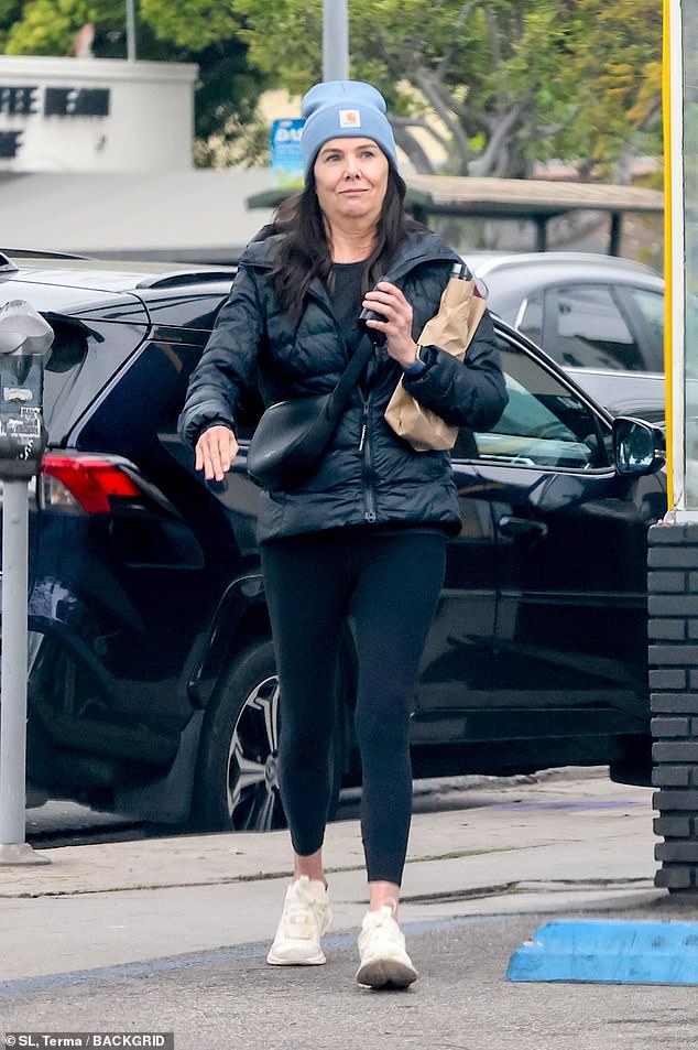 The 58-year-old Gilmore Girls alum sported a baby-blue beanie, black puffer jacket, matching leggings, and white sneakers for her outing.