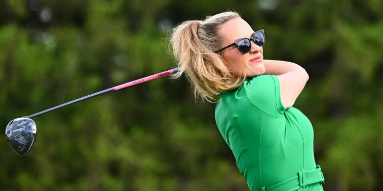 Paige Spiranac hits a tee shot during The Creator Classic prior to the Truist Championship at The Philadelphia Cricket Club (Wissahickon Course) May 7, 2025, in Flourtown, Philadelphia. (Tracy Wilcox/PGA Tour via Getty Images)
