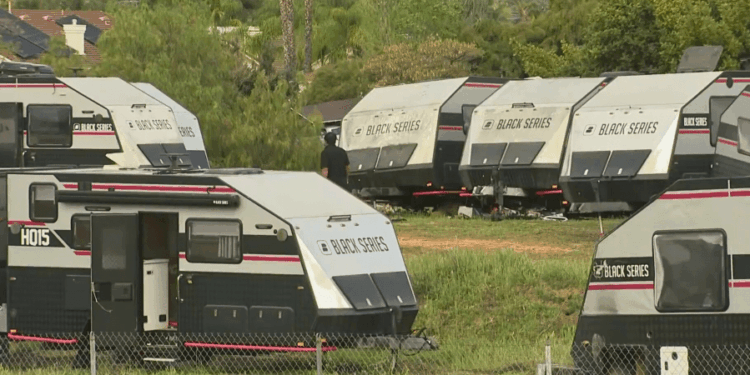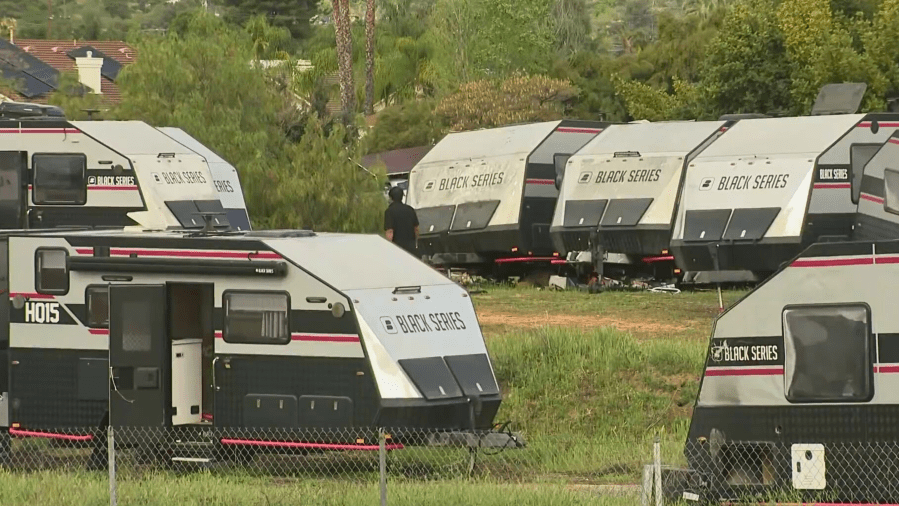 Video recorded on Thursday showed the trailers crammed into a lot near homes and businesses on the 20700 block of Palmar Street.