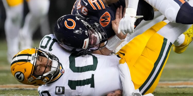 Jordan Love #10 of the Green Bay Packers is hit by Austin Booker #94 of the Chicago Bears during the second quarter against the Chicago Bears at Soldier Field on Dec. 20, 2025 in Chicago. (Patrick McDermott/Getty Images)