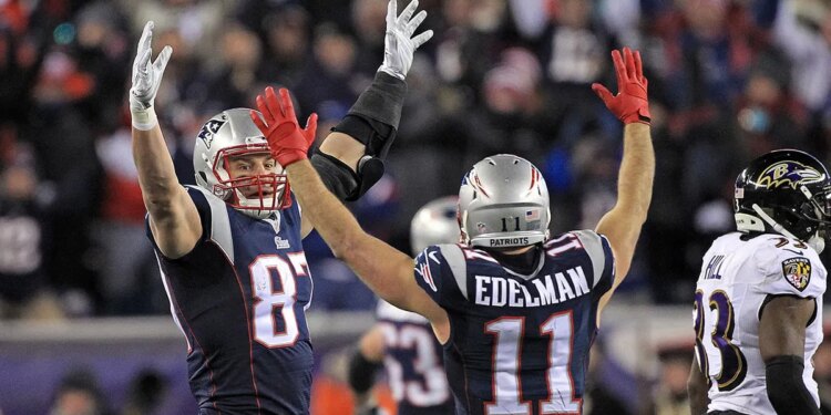 New England Patriots wide receiver Julian Edelman raises his hands in celebration with tight end Rob Gronkowski after throwing a touchdown pass to wide receiver Danny Amendola during the third quarter of the NFL divisional playoff football game at Gillette Stadium on Saturday, Jan. 10, 2015. (Matt Stone/MediaNews Group/Boston Herald via Getty Images)