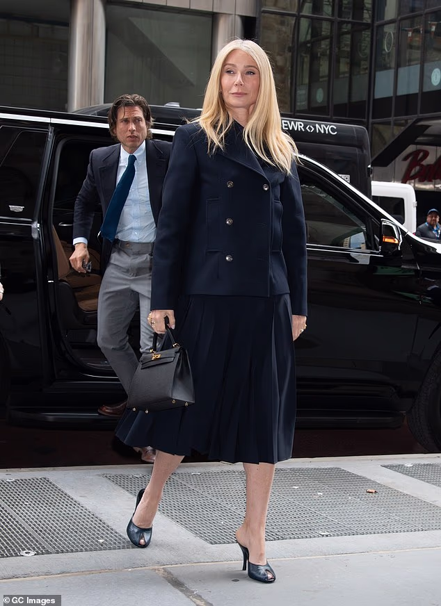 Paltrow was dressed conservatively in a two-piece ensemble that featured a brass-buttoned jacket and pleated skirt along with peep-toe mules