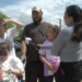 Songstress Ebony Riley jazzed up her simple crop top and jeans with such accoutrements as a print bandanna and a belly chain.