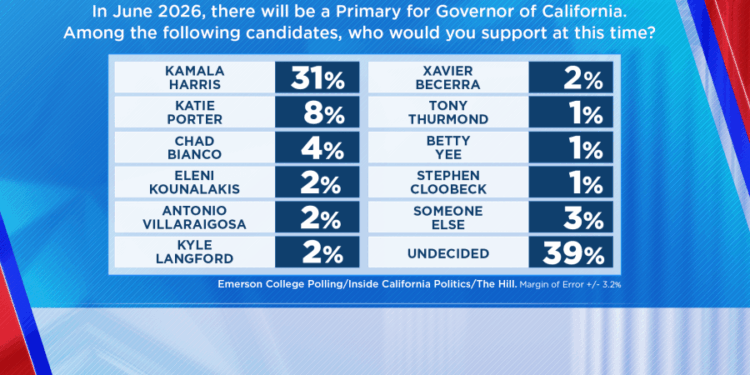“How competitive the 2026 gubernatorial primary in California is depends on whether Harris runs. Other candidacies, like Katie Porter’s, are contingent on whether the former vice president enters the race,” said Spencer Kimball, executive director of Emerson College Polling. “Harris garners 49% of Democrats, while Porter gets 13%. Without Harris in the race, Porter’s support among Democrats rises to 21%, which would make her an early frontrunner in a crowded field.”
