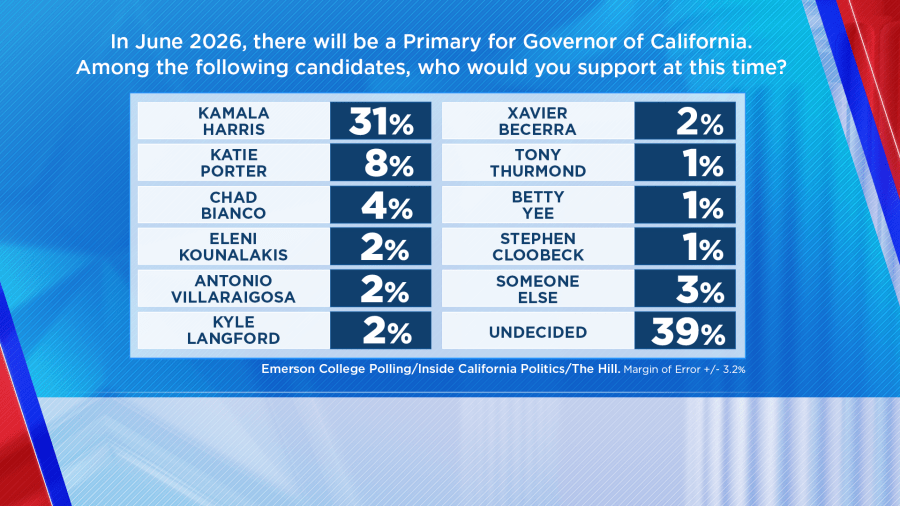 It found 31% of those who plan to vote would support Harris if she were to enter the race. Fellow Democrat Katie Porter follows with 8%, while 4% support Riverside County Sheriff Chad Bianco, a Republican.