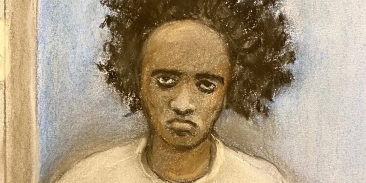 Illustration of Axel Rudakubana, a Black man with a serious expression and dark curly hair, wearing a light-colored top, sitting at a wooden table in a courtroom.