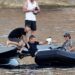 Costumed revelers walk the plank and jump off the tall ship Denis Sullivan and into Boston Harbor during a heatwave in Boston, Massachusetts, on June 20, 2024.