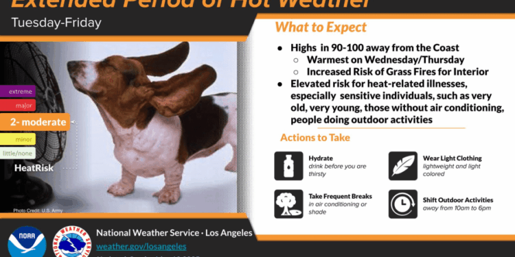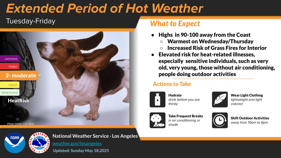 Above-average temperatures arrived Monday and will continue to climb on Tuesday, with the San Fernando Valley reaching the mid-90s. The high is expected to top out closer to 100 degrees on Wednesday and Thursday.