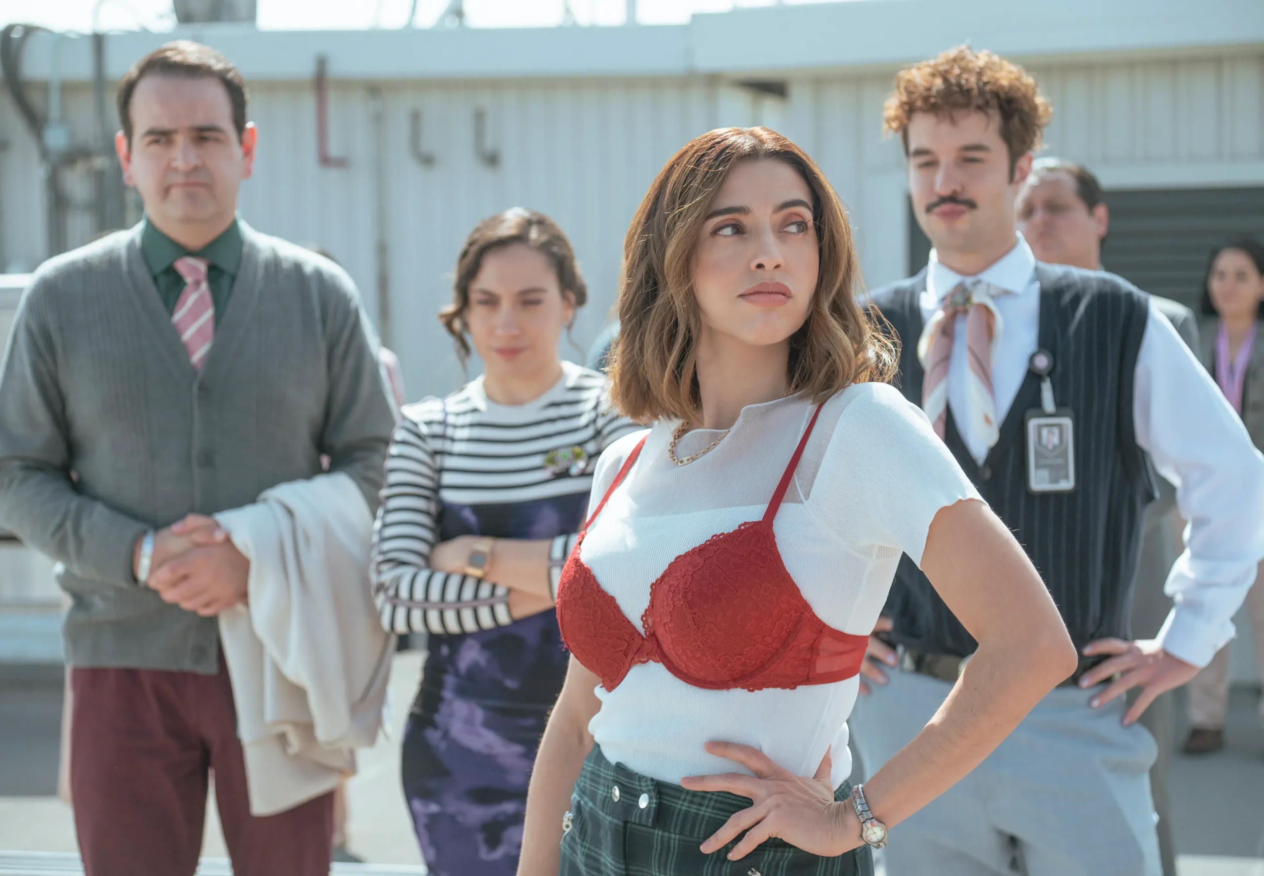 Stars of the Mexican series Love from 9 to 5, featuring (L to R) Fernando Memije as Lalo, Martha Reyes as Mariel, Ana González Bello as Graciela, Nicolás de Llaca as Victor in Amor de Oficina. Carlota Murillo–Netflix