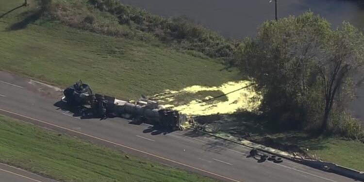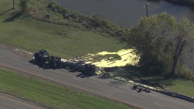 According to aerial views of the scene, signage on the truck involved says it was transporting molten sulphur.
