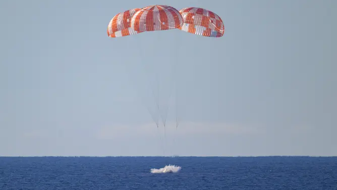 NASA’s Orion spacecraft with Artemis II crewmembers NASA astronauts Reid Wiseman, commander; Victor Glover, pilot; Christina Koch, mission specialist; and CSA (Canadian Space Agency) astronaut Jeremy Hansen, mission specialist aboard are seen as it lands in the Pacific Ocean off the coast of California, Friday, April 10, 2026.