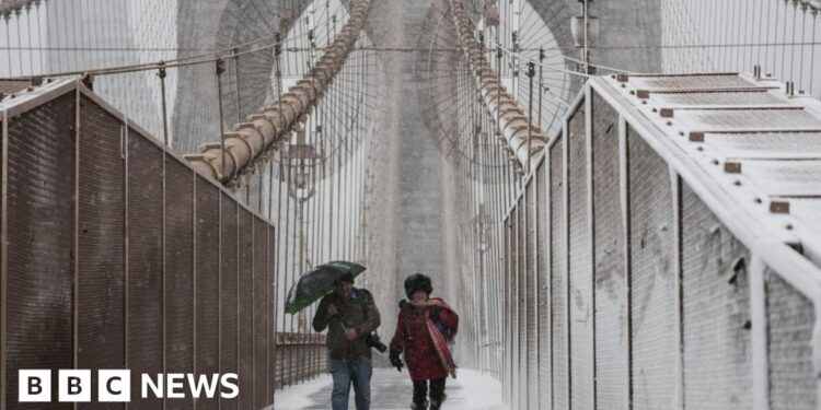 As of midnight local time (05:00 GMT) on Monday, much of the north-east had already been blanketed in several inches of snow, with 10 inches (25cm) reported in Manorville, New York and Howell, New Jersey, according to the US National Weather Service (NWS).