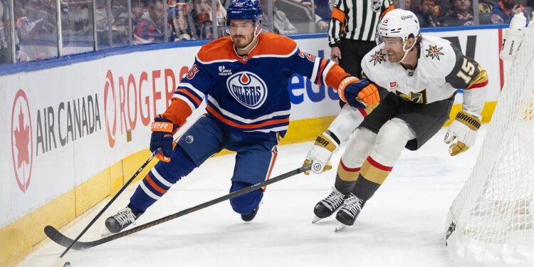 Vegas Golden Knights’ Noah Hanifin and Oilers’ Jack Roslovic battle for the puck in Edmonton, Alberta, on April 4, 2026. (Jason Franson/The Canadian Press)