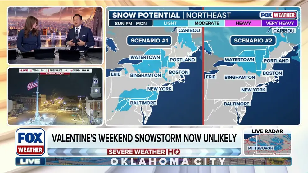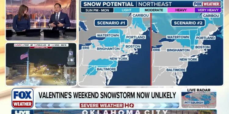 NEW YORK – The FOX Forecast Center is closely monitoring a complicated snow forecast for the Northeast this Valentine’s and Presidents’ Day weekend. Fortunately for those celebrating this holiday weekend, a major winter storm appears to be unlikely, according to the latest computer forecast models.