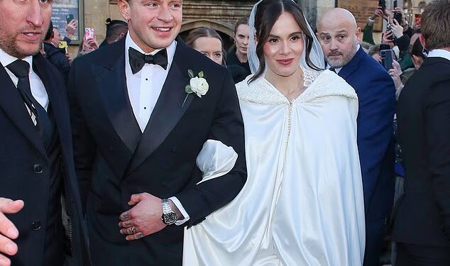 Holly swept into her wedding in Bath Abbey on the arm of her celebrity chef father, but kept her lace gown concealed beneath a billowing hooded ivory cloak.