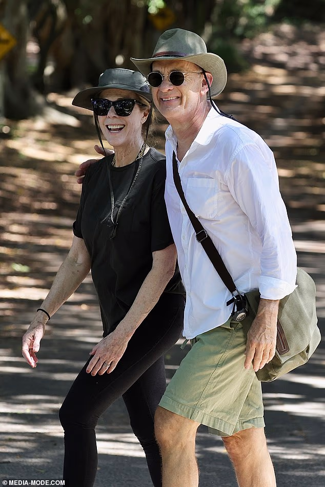 Tom Hanks and wife Rita Wilson put on their walking gear for a low-key stroll around Shark Beach and along the scenic Hermitage Foreshore walking track on Saturday