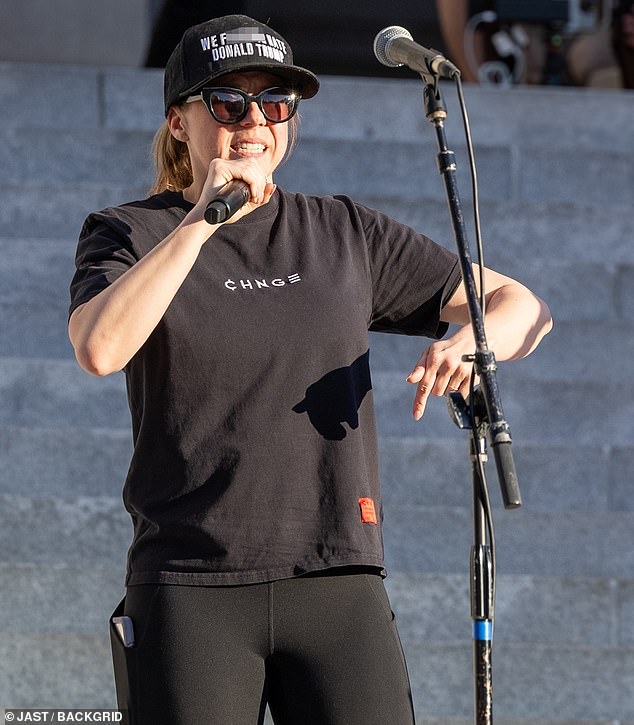 The actress sported a black cap on top of her head which had the words ‘We f***ing hate Donald Trump‘ printed on the front in white lettering.