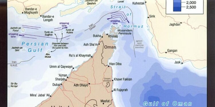 The Strait of Hormuz, showing political boundaries and shipping lanes. (Map: University of Texas Libraries, 2004).
