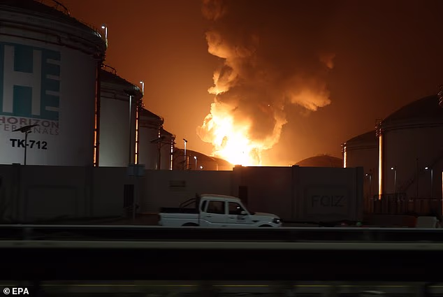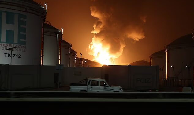 As the conflict in the Middle East threatens to spiral into global war, experts have revealed how to survive a strike from one of Iran’s deadly Shahed drones. Pictured: Flames rise from the oil refinery hub in Fujeirah, United Arab Emirates, after a drone strike