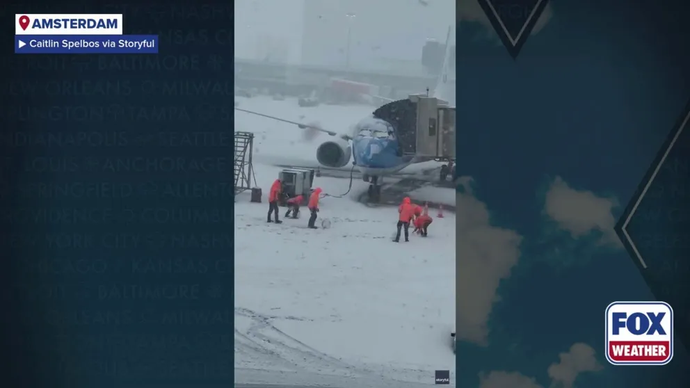 Workers at Amsterdam Airport Schiphol were caught on video having a good time in the freshly fallen snow near some parked airplanes. Hundreds of flights have been disrupted as winter weather continues to impact Europe.