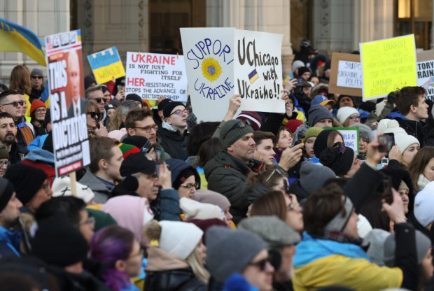 Hundreds gathered downtown Saturday, waving Ukrainian flags and carrying signs that read “Ukraine is not for sale” and “Putin the war criminal.” The group, which included politicians and veterans of the Ukrainian Armed Forces, also sang the Ukrainian national anthem and marched down Michigan Avenue.