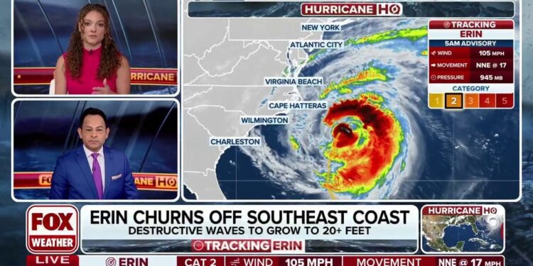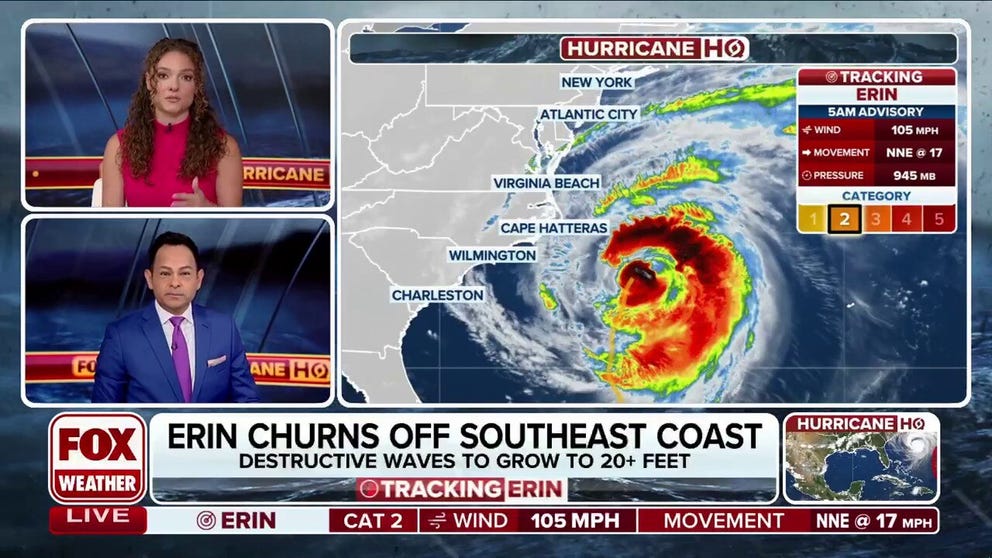 Hurricane Erin is charging northward off the North Carolina coast as its outer bands produce tropical-storm-force winds, monster waves and life-threatening rip currents along the coasts of North Carolina and Virginia. FOX Weather meteorologists Craig Herrera and Bayne Froney have the latest on Thursday morning, Aug. 21, 2025.