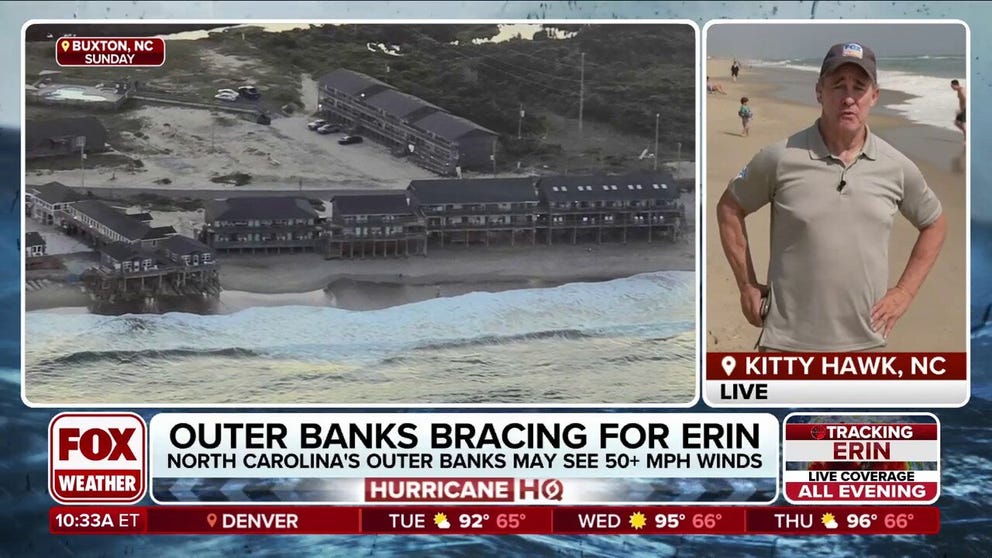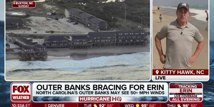 “The biggest impact from Erin’s passage paralleling the East Coast will be from the large, eroding waves and strong currents caused by the huge expanse of strong winds blowing over the ocean,” Norcross said. “The peak impacts along the beaches and in the waterways from Palm Beach County, Florida, to Cape Hatteras, North Carolina, look likely to occur (Tuesday) into Thursday, although the disturbed ocean will begin to be noticeable (Monday).”