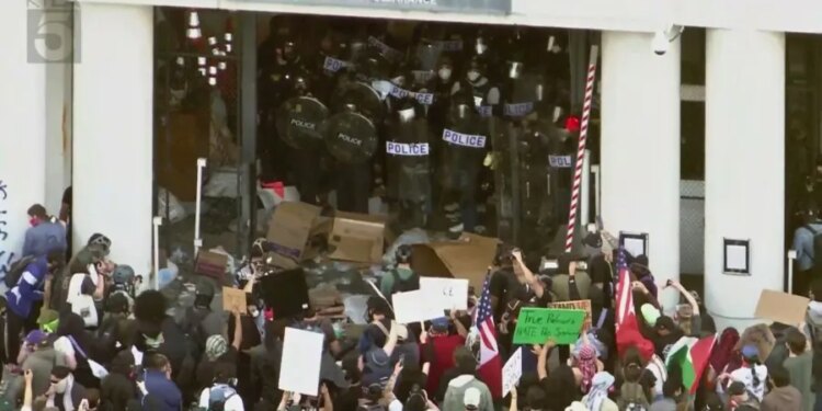 Officers are pushing the crowds back, but if the situation continues to escalate, LAPD will likely declare the gathering an unlawful assembly and issue a dispersal order.