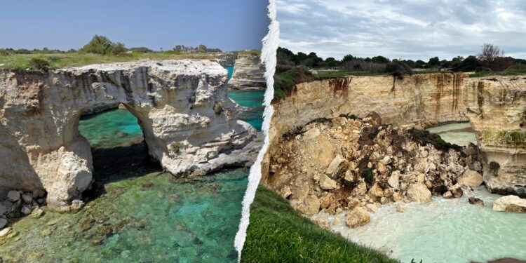 The “Lovers’ Arch” near Melendugno in southern Italy is shown at left in 2018. On Saturday, Feb. 14, 2026, the rock structure collapsed following days of bad weather. (DEA/V. Giannella; Paolo Manzo/NurPhoto via Getty Images)