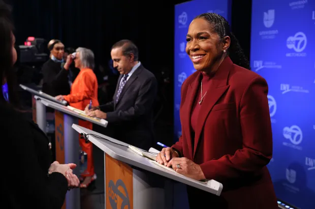 U.S. Senate contender Lt. Gov. Juliana Stratton (right) prepares alongside fellow contenders U.S. Reps. Robin Kelly (third from right) and Raja Krishnamoorthi (second from right), before their debate on Jan. 29, 2026, at WLS-Ch. 7. (Chris Sweda/Chicago Tribune)