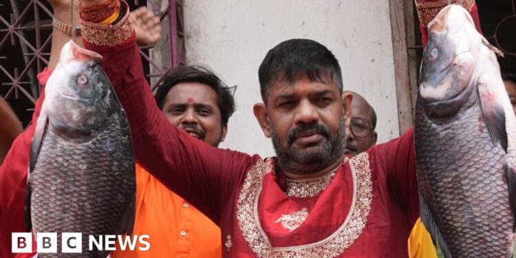 A few kilometres away in Kolkata’s port area, another BJP candidate, Rakesh Singh, stages a similar spectacle. Dressed for effect and flanked by party workers, he hoists a fish repeatedly as he moves through early-morning crowds, taking on the city’s mayor Firhad Hakim in one of the state’s high-profile contests.