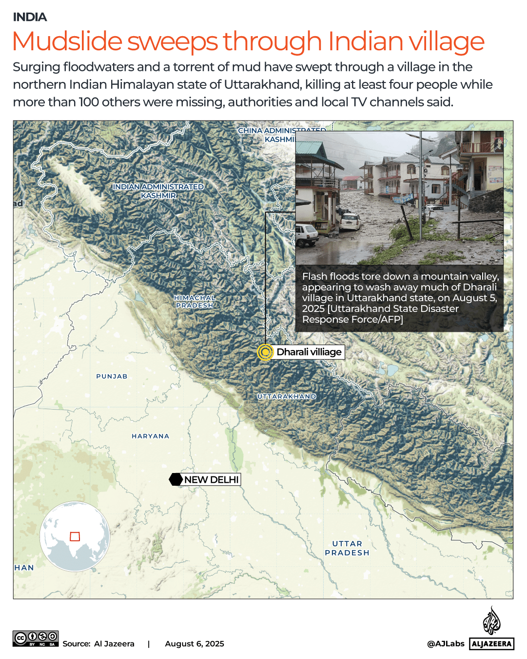 More than 100 people are missing and at least four people have died after flash floods swept through the village of Dharali, in the north Indian state of Uttarakhand.
