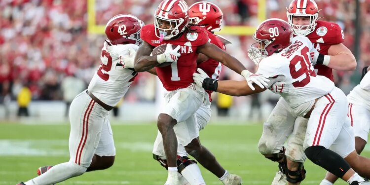 Roman Hemby (1) of the Indiana Hoosiers runs with the ball in the fourth quarter against the Alabama Crimson Tide in a College Football Playoff quarterfinal at Rose Bowl Stadium Jan. 1, 2026, in Pasadena, Calif. (Sean M. Haffey/Getty Images)
