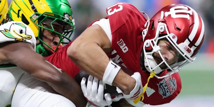 Elijah Sarratt #13 of the Indiana Hoosiers is tackled by Ify Obidegwu #7 of the Oregon Ducks during the first quarter in the 2025 College Football Playoff Semifinal at the Chick-fil-A Peach Bowl at Mercedes-Benz Stadium on January 09, 2026 in Atlanta, Georgia.  (Kevin C. Cox/Getty Images)