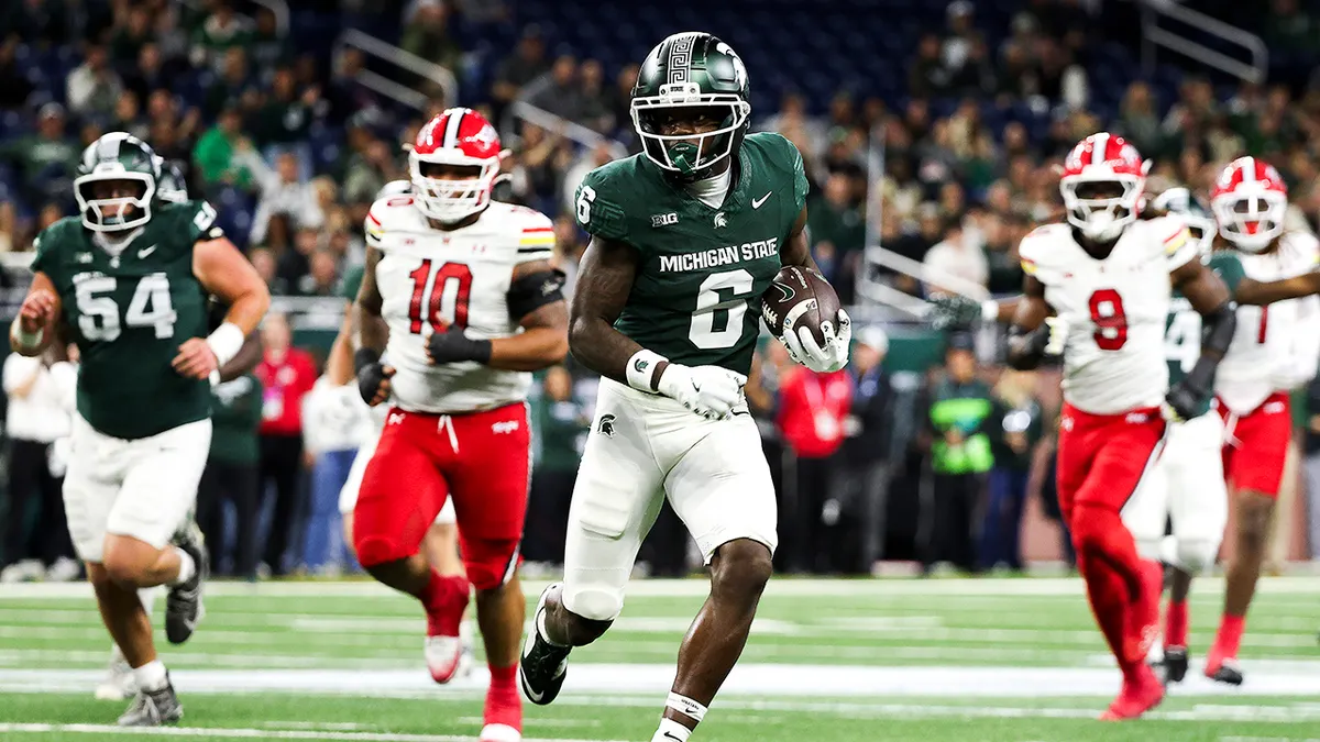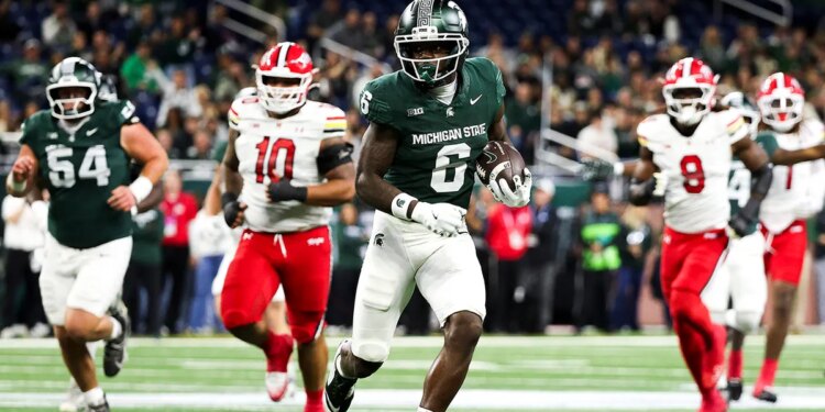 Nick Marsh (6) of the Michigan State Spartans runs the ball up the field during the first quarter of a game against the Maryland Terrapins at Ford Field Nov. 29, 2025, in Detroit. (Mike Mulholland/Getty Images)