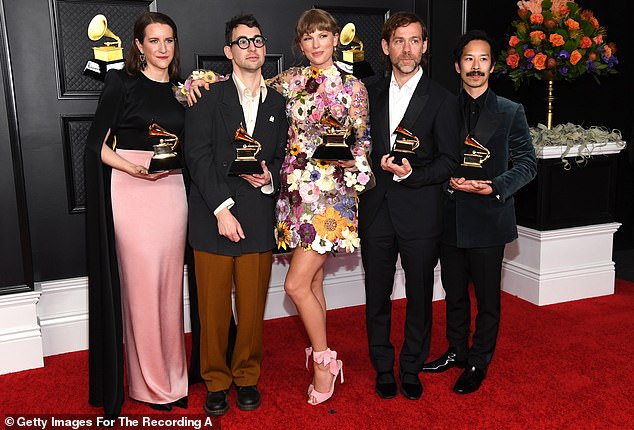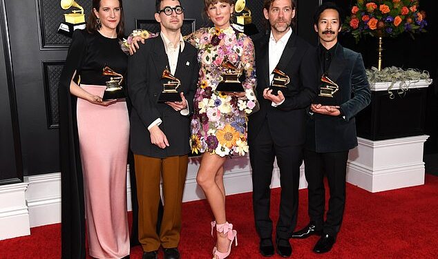 Some Taylor Swift fans were celebrating early on Tuesday morning after alleged leaked track lists for Swift’s newly announced album The Life Of A Showgirl suggested that her longtime collaborator Jack Antonoff was not involved as a producer or co-songwriter; Laura Sisk, Antonoff, Swift, Aaron Dessner and Jonathan Low pictured in 2021 in LA