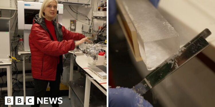 The BBC’s Rebecca Morelle is with scientists as they melt the last few ice cores for analysis – these are the very oldest, at least 1.5 million years old.