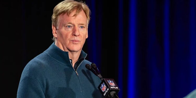 NFL Commissioner Roger Goodell speaks during a press conference after Super Bowl LX at Moscone Center in San Francisco, Calif., on Feb. 9, 2026. (Matthew Huang/Icon Sportswire)