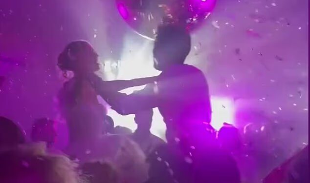 The newlyweds were cheered on by their loved ones as they danced under a huge disco ball and confetti rained down.