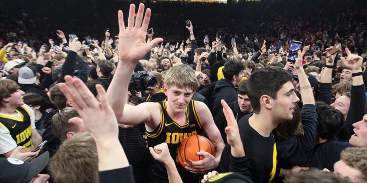 Forward Cooper Koch of the Iowa Hawkeyes celebrates with fans after the match-up against the Nebraska Cornhuskers on Feb. 17, 2026, at Carver-Hawkeye Arena, in Iowa City, Iowa. ( Matthew Holst/Getty Images)