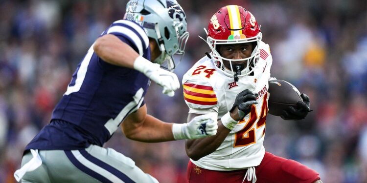 Iowa State Cyclones running back Abu Sama III #24 in action against Kansas State Wildcats safety Logan Bartley #10 during the 2025 Aer Lingus College Football Classic match between Kansas State University and Iowa State University at the Aviva Stadium in Dublin. (Brendan Moran/Sportsfile via Getty Images)