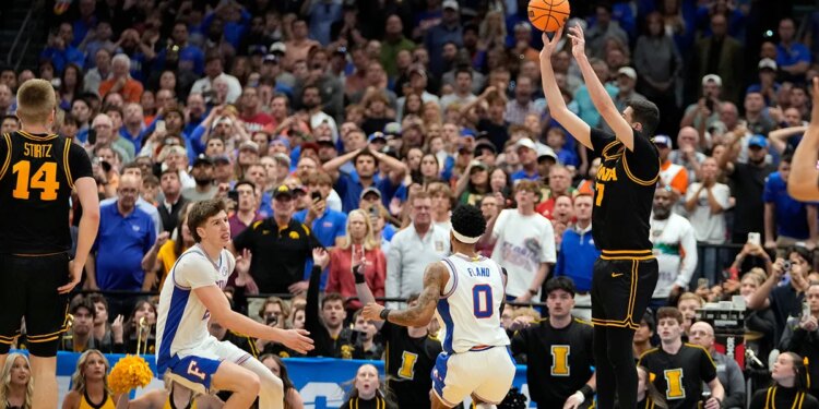 Iowa forward Alvaro Folgueiras (7) puts up a three point shot against Florida during the second half in the second round of the NCAA college basketball tournament Sunday, March 22, 2026, in Tampa, Florida. (AP Photo/Chris O’Meara)