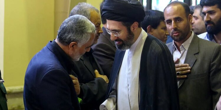 IRGC Cmdr. Qassem Soleimani shakes hands with Mojtaba Khamenei. (Mehdi Ghasemi/West Asia News Agency via Reuters)